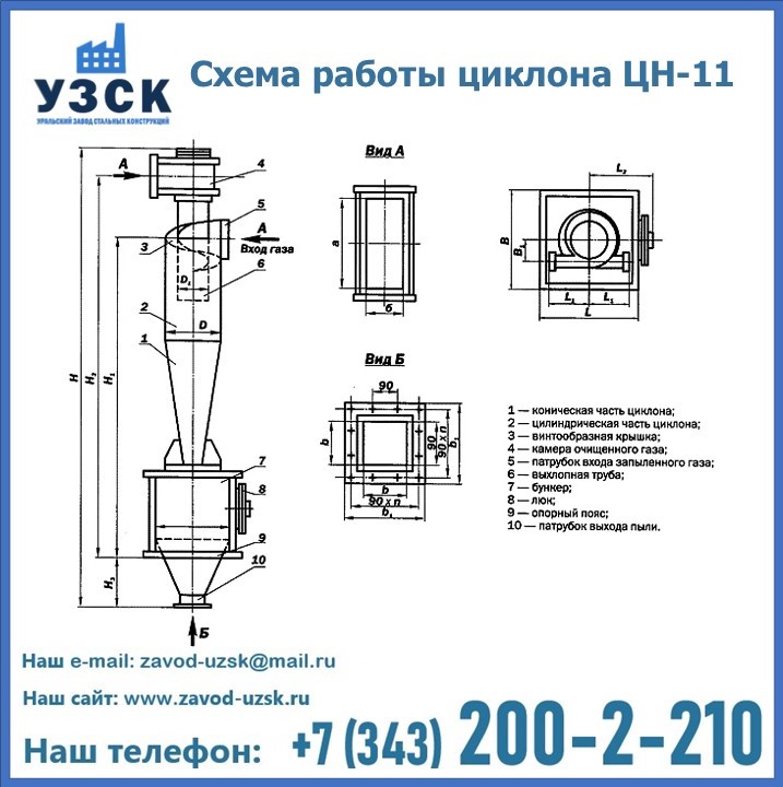 При этом ощутимой разницы в цене между универсальным и узконаправленным, подобранным в соответствии с конкретными техническими требованиями циклоном, нет. Стоимость воздухоочистительного оборудования типа циклон обусловлена маркой и толщиной стали, из которого он изготовлен, сложностью и специфичностью конструкции, наличием дополнительного оснащения (бункер, улитка и другие). При необходимости, на заводе УЗСК в Красногорске будет изготовлен циклон по индивидуальным техническим чертежам заказчика.