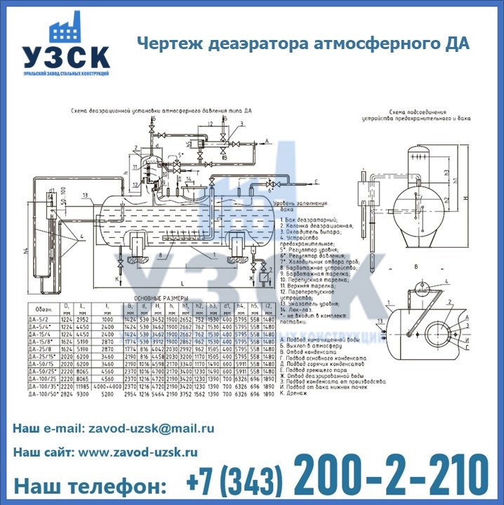 Приобрести качественное оборудование, в том числе, деаэраторы ДА, можно в компании УЗСК в Красногорске. Мы предлагаем долговечную и надежную продукцию по приемлемой цене. Заказать и купить деаэраторы или другие изделия высокого качества можно через сайт Уральского Завода Стальных Конструкций, или позвонив по указанному в разделе «Контакты» телефону.